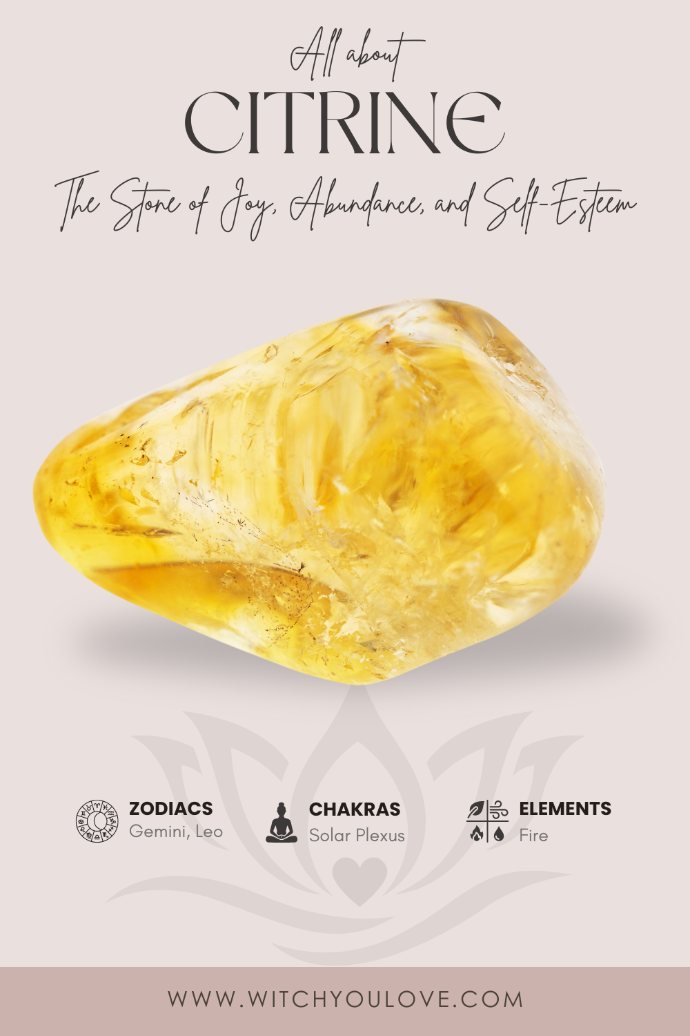 Citrine improves digestion, strengthens endurance, purifies the body of toxins, improves the circulation of blood, and strengthens the immune system. It encourages proper metabolism, directs personal power, and balances the Solar Plexus Chakra. Citrine harnesses the energy of the sun, bringing sunshine and light to all areas of life, and promoting a sense of happiness and light. It is known to increase the value in healing the spiritual self, as it is a powerful cleanser and restorator, transferring the goodness of self-healing and self-improvement.
